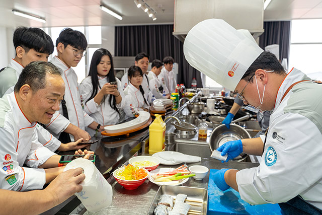 Later, the visiting delegation came to Yantai Vocational College of Culture and Tourism. 4 famous chefs cooked their speciality on the scene for the delegation feeling the cooking skills and particular flavor of Shandong cuisines.