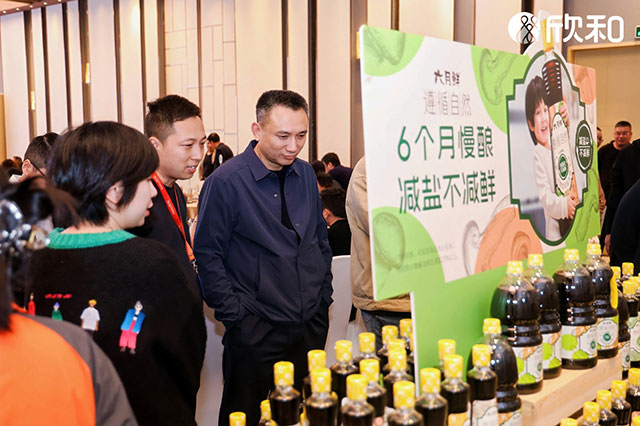 The new product exhibition booth on site attracted a large number of visitors. One dealer took a bottle of LIU YUE XIAN · ZUN XUN ZI RAN 0-additive premium less-salt light soy sauce and observed the list of ingredients for a long time.