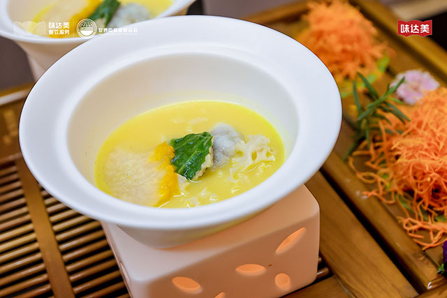 The dish was created based on the theme of “pursing freshness”. On the basis of the traditional “fresh fish and mutton”, Master Shao improves the delicacy and visual aesthetics of the dish through fusion skills to make it a good choice in winter. Chop the mutton, add allium mongolicum regel and water chestnut, and wrap it with malabar spinach to make it into a dumpling shape to imply the meaning of reunion. The stuffing is seasoned with WEI DA MEI SHANGPIN cooking wine, WEI DA MEI Yuhaichu Urechis Unicinctus Powder, etc. Sprinkle starch on the bass and pat it into transparent and smooth glass fish fillets, wrap it with mutton and start steaming. The taste is smooth and tender; it is served with embroidered cocci and golden ear fungus. Cooking method of the golden soup: Braise soup using the fried fish bones at high heat for 5min. Add WEI DA MEI sour soup paste, WEI DA MEI light rice vinegar and WEI DA MEI Yuhaichu Urechis Unicinctus Powder 1 min before the dish is served. It tastes slightly sour and spicy when entering the mouth with a lasting delicious flavor.