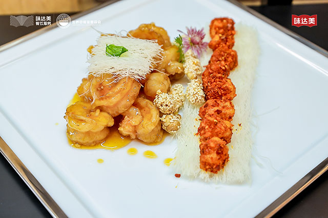 Inspired by the traditional Henan dish “Sweet and Sour Fried Carp Baked Noodles”, the chef replaced fish by shrimps to get rid of fishbone, making it more suitable for the elderly, children and ladies. Matched with iron stick yam and homemade baked noodles, this dish perfectly combines local characteristics with rich taste. While curing shrimps, the chef used WEI DA MEI SHANGPIN cooking wine to remove the fishy smell and increase freshness. When shrimps are mixed with sauce, heat the wok; after leaving the fire, firstly put sugar, then add WEI DA MEI light rice vinegar, which complements the seafood and highlights its fresh flavor. The ratio of sugar to vinegar is 1:1, then add a little salt to neutralize it, stir quickly for 20s, then increase the heat and thicken it for about 30s. The shrimp coated with sauce has compound taste, slightly sour and slightly sweet. Cut the iron stick yam into sections, fry it after attaching with powder; after the sugar can be drawn through heating, evenly wrap it with HUANG FEI HONG Crispy Chili. The yam is soft inside, but crisp outside, with a sweet and slightly spicy flavor.