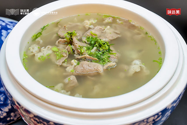 By taking “freshness” as the core, highlighting the fresh and original flavor of mutton itself, and following the modern health concept and the Chinese medicine dietetic invigoration culture, Master Tian presented a fresh dish suitable for nourishing the body and mind in autumn and winter. During cooking, the lamb spine was stewed for 40min to keep the soup clear; slice the lamb shank thinly, blanch it quickly for 5s, in order to keep the tender taste. The soup base is only seasoned with salt alone, to fully highlight the delicious original taste of mutton, and it is also supplemented by a handful of coriander. Matched with a bowl of special dip sauce, use WEI DA MEI Premium Soy Sauce, WEI DA MEI spicy fresh sauce, WEI DA MEI light rice vinegar, add a little sugar, the paste finally reflects salty and slightly spicy. It serves mutton to relieve boredom and improve taste.