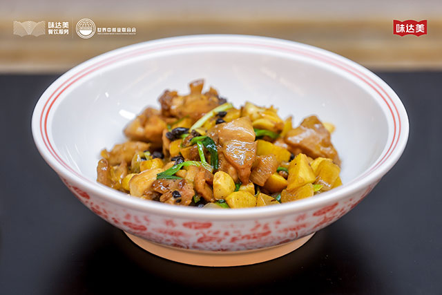 The chef creates a delicious, juicy and salty chicken by referring to the Guangdong flavor and using such ingredients as scallion, ginger, garlic and fermented soybean. Marinate the chicken legs and chicken back in the sauce containing WEI DA MEI Delicate Golden Mark Oyster Sauce, WEI DA MEI SHANGPIN cooking wine and WEI DA MEI Premium Soy Sauce for 5min, to remove odor and nourish the chicken with base flavor. Stir-fry scallion, ginger and garlic, add soybeans and chicken in order; then sprinkle WEI DA MEI SHANGPIN cooking wine along the side of the pot to stimulate the aroma and enhance the flavor, fry the chicken at low heat and slowly until the surface turns slightly yellow, then increase the heat to make the dish color more appetizing. The whole process costs 10-15min. The dish served is in special flavor: Salty and spicy mellow taste with the fragrance of soybeans.