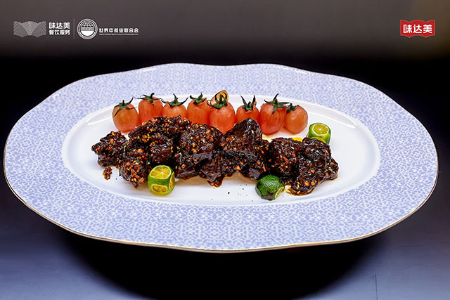 The dish was served by integrating Henan’s local food culture with the Sichuan cuisine elements of Chongqing, where the chef surnamed Peng was born. The chef highlights the mutton flavor with classic “special flavor” of Sichuan cuisine: Hot, spicy, salty, sweet and sour, which conforms to the mean culture in the Central China. The five flavors were mixed in a harmonious manner and not in conflict with each other. The main ingredient is the tender foreleg of lamb. Firstly, fry it with butter at medium heat for 2min, cover with sauce and fix it into shape. Stir-fry ginger, onion, carrot, coriander, dried tangerine peel, etc. at high heat and then at low heat, add the chopped mutton and stir-fry them together to neutralize the smell of mutton with the fragrance of vegetables. Prepare the special flavor sauce using WEI DA MEI rocky candy dark soy sauce, LIU YUE XIAN braising soy sauce, WEI DA MEI Premium Soy Sauce, WEI DA MEI light rice vinegar, sugar, etc. When the mutton reflects the sauce red color, spray WEI DA MEI SHANGPIN cooking wine to remove the inherent odor of mutton and improve freshness; add water to stew it, and do not overuse spices and broth in order to highlight the original taste of the ingredients. After being fried, the mutton is crispy and fragrant externally and tender and delicious internally. Add some HUANG FEI HONG Crispy Chili instead of the Daokou chill before the dish is served. Add some tomatoes which are peeled off after being soaked in salt water in the plate in order to improve the agreeable taste.