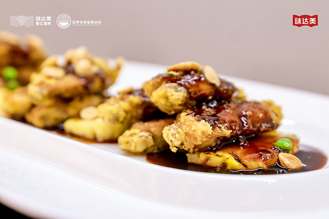 Inspired by cola chicken wings, the chef aims to create a sweet, sour and refreshing dish with pineapple and apricots. First, marinate the chicken wings with WEI DA MEI SHANGPIN cooking wine, WEI DA MEI Premium Soy Sauce, salt and pepper to remove the odor and nourish the wings with base flavor; fry them at 150℃ for 3min. Then, take them out, and fry them again at a little bit higher oil temperature, to make them crispy outside but tender inside. Put them into the plate and directly sprinkle sauce on them. In particular, the sauce contains WEI DA MEI rocky candy dark soy sauce, WEI DA MEI Premium Soy Sauce and WEI DA MEI light rice vinegar and is boiled at a high heat for 40s. During the boiling process, stir-fry it quickly to prevent sugar from coking, thus producing bitterness, to keep the color bright and to facilitate the attachment on the wings. Pineapples are also used, which are first soaked in salt water, then blanched in hot water and fried with butter to stimulate the fruit aroma. Some apricots and honey beans are used to enhance the flavor further.